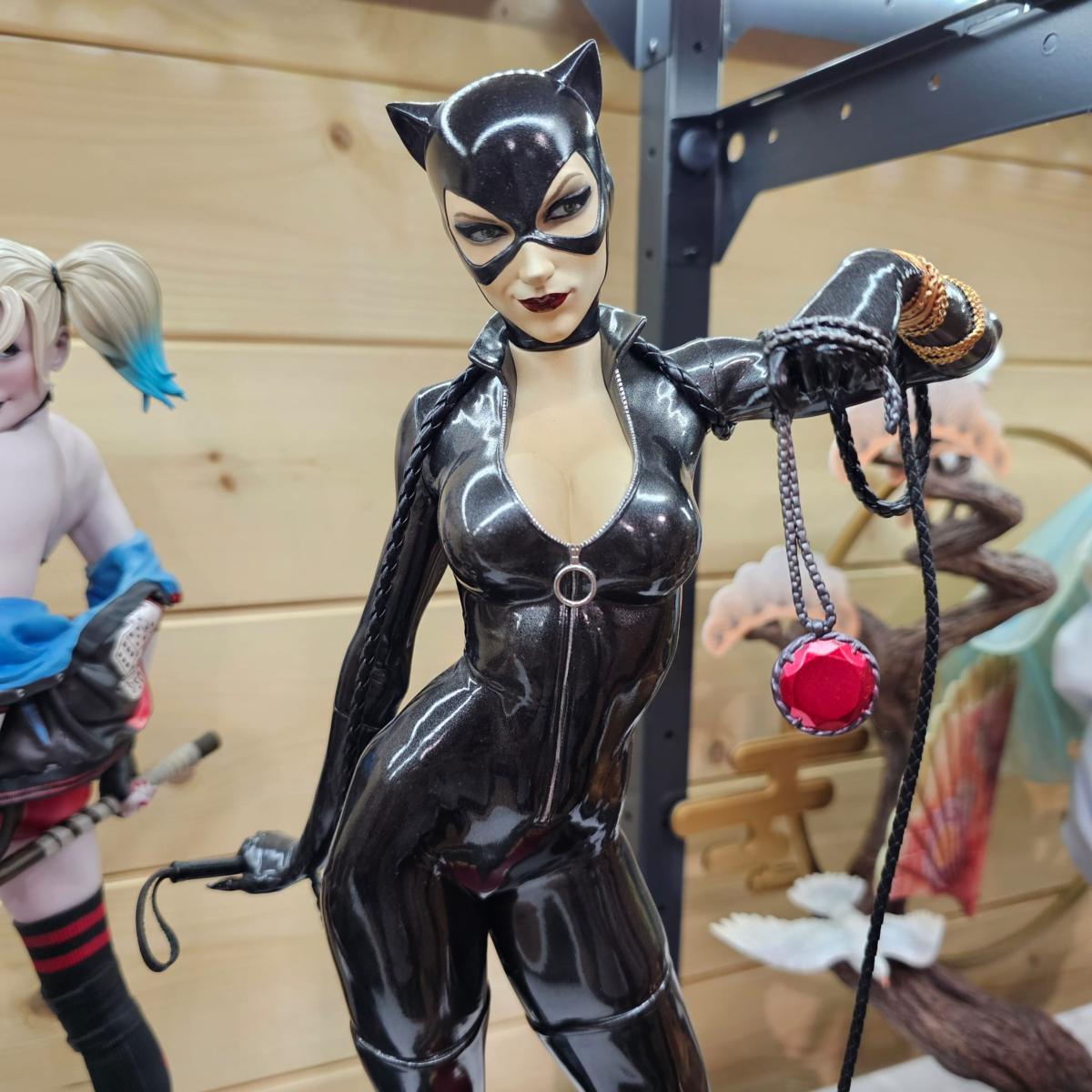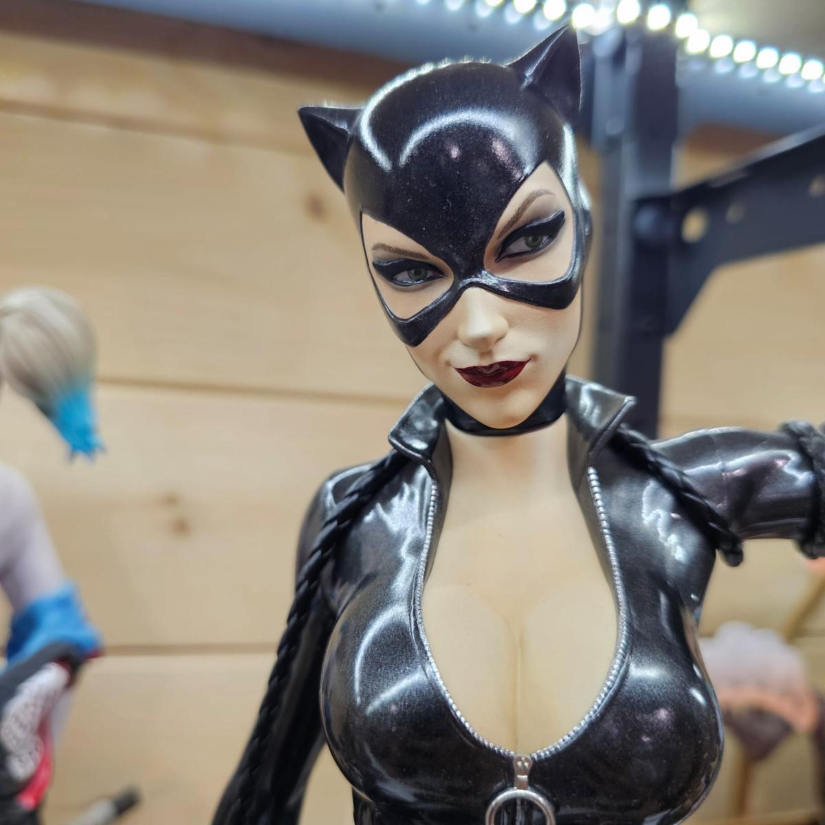 Une interprétation iconique de Selina Kyle / Catwoman, avec pose dynamique, costume satiné et décor soigné.